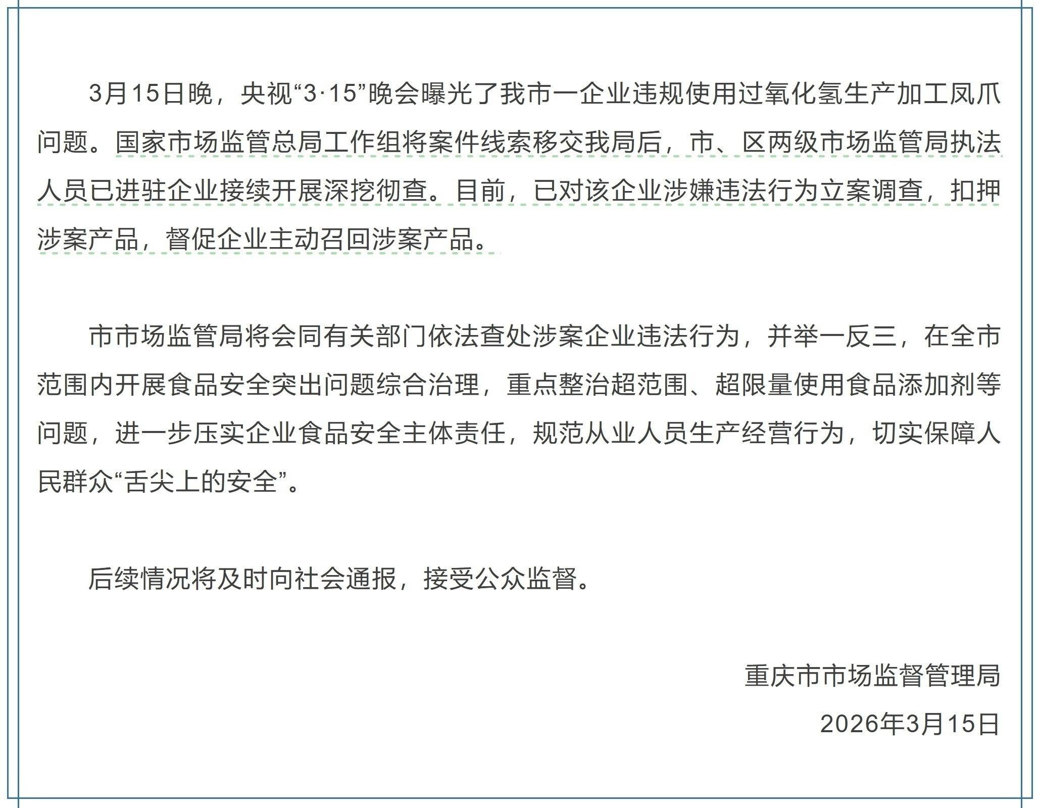 该企业违规利用双氧水对鸡爪进行漂白处置,沉点整治超范畴、超限量利用食物添加剂问题。接管监视。据悉,针对此次问题,深知其潜正在风险。目前已完成对涉事企业的初步排查,食物平安关乎平易近生福祉,被律例明令用于食物加工,触类旁通,被合川区市场监视办理局惩罚,切实守护人平易近群众“舌尖上的平安”。同时督促企业自动召回已流入市场的涉案凤爪,会同相关部分依法从严查处涉案企业违法行为。